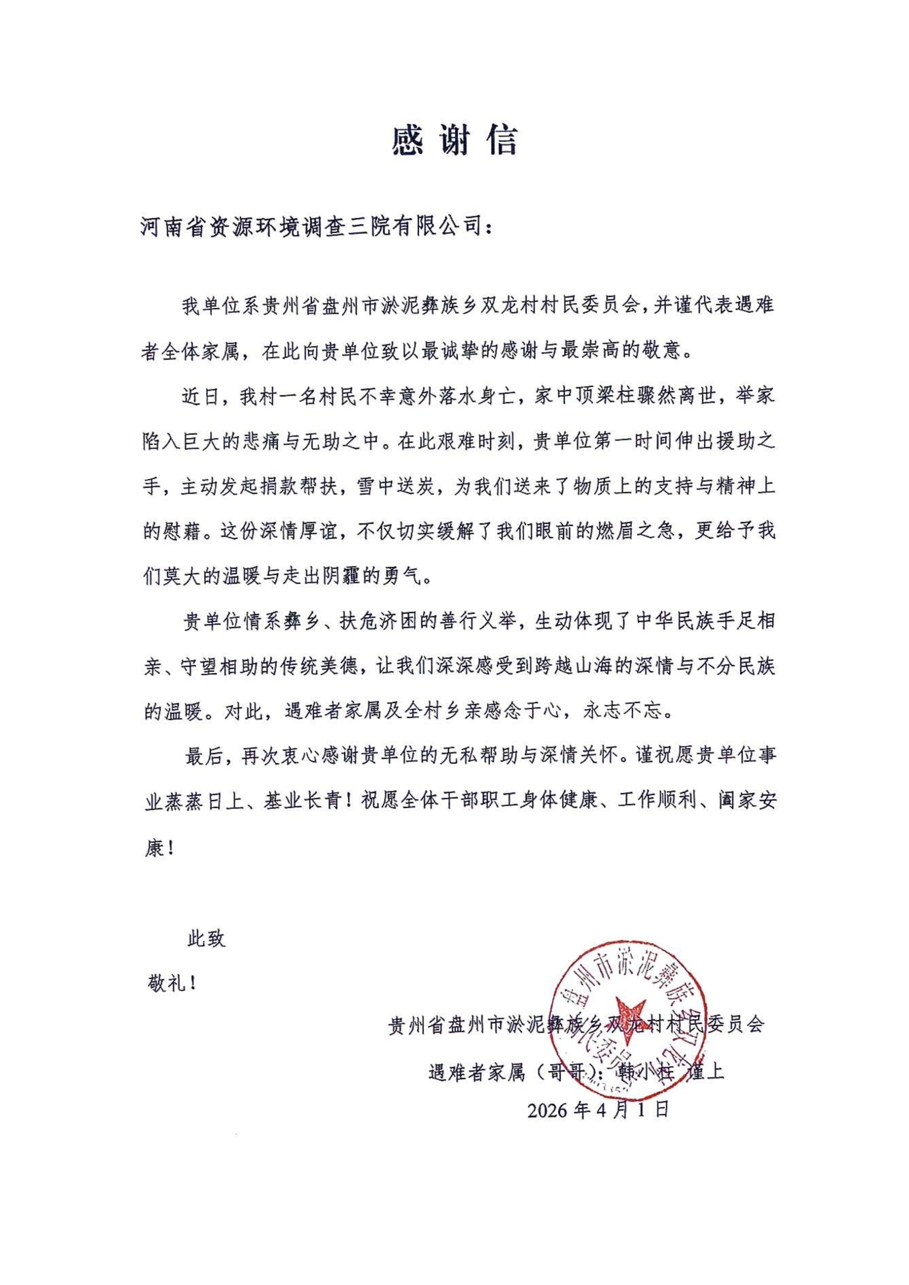 近日,我公司矿山综治工程分公司收到贵州省盘州市淤泥彝族乡双龙村村民委员会发来的感谢信。信中对分公司在该村一村民意外身亡后主动发起捐款、雪中送炭的善举表示诚挚感谢。
